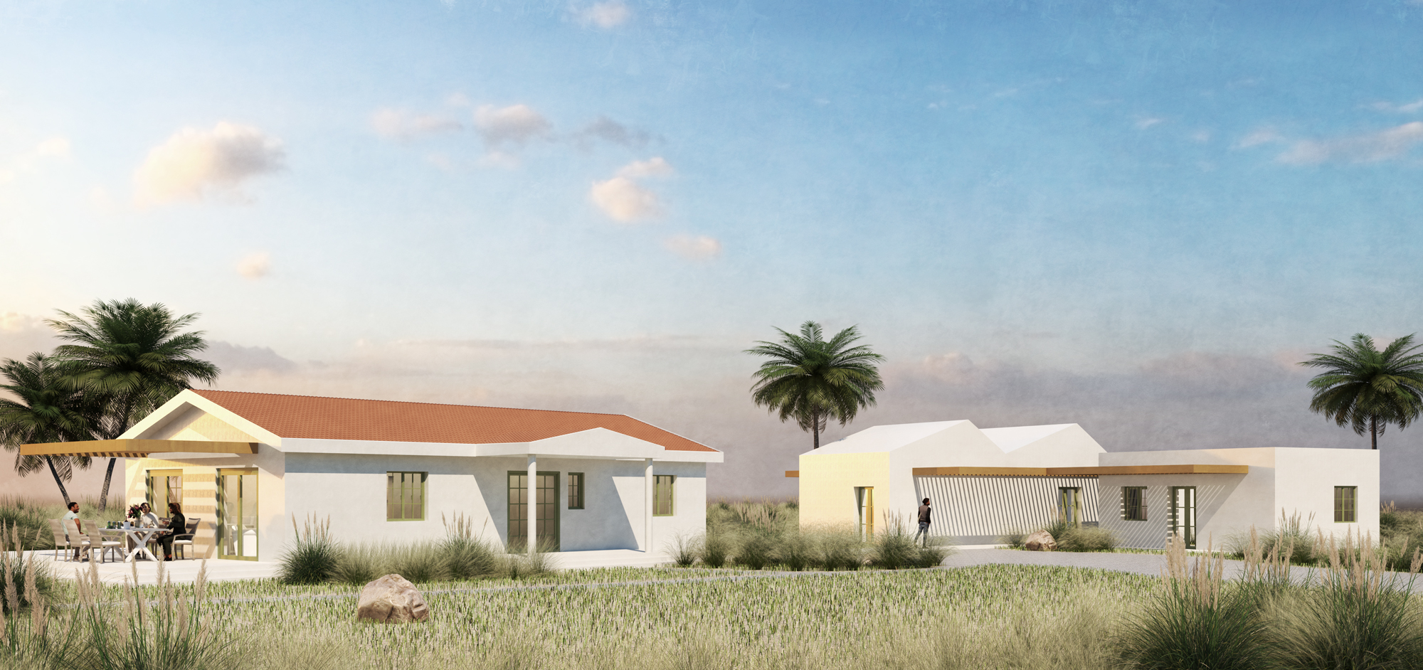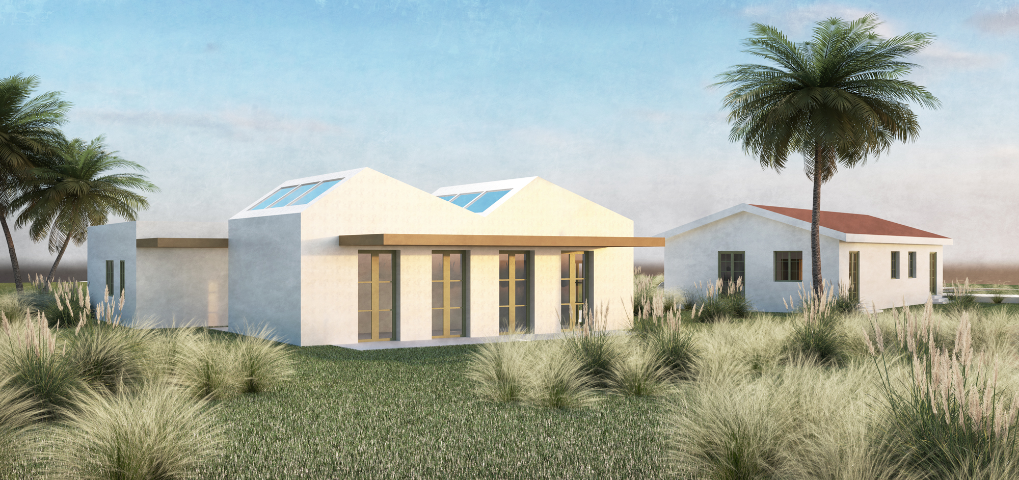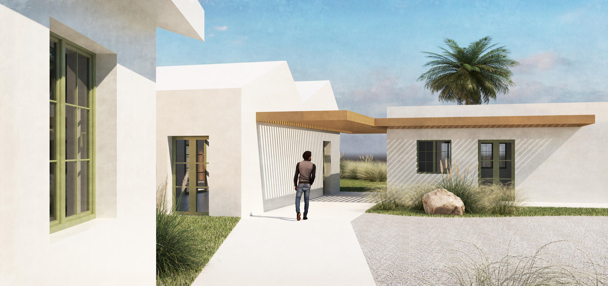 The site will also include additional storage space and parking. A defined entrance with a water feature will offer a restful arrival experience. The garden will be kept semi-wild with trees and a swimming pool surrounded by fully grown palm trees.