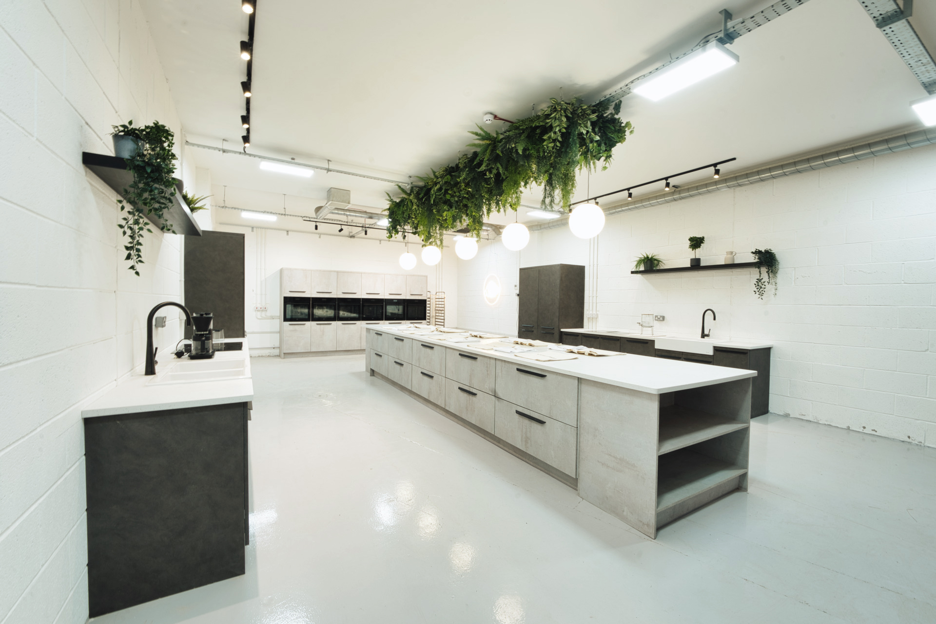 The layout is anchored by a generous central island, allowing multiple participants to work comfortably side by side. Clean concrete tones, matte finishes, and streamlined cabinetry create a minimalist yet inviting atmosphere. Suspended globe lighting adds a sense of softness, while overhead greenery brings a touch of nature into the heart of the studio.